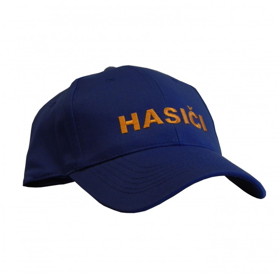 Modrá čepice se žlutým nápisem HASIČI více informací